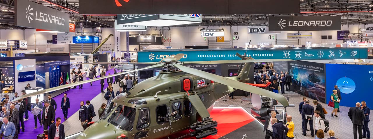 A Leonardo AW149 helicopter on display at DSEI 2023. (DSEI)