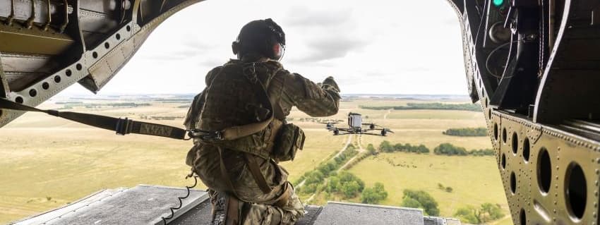 A small drone launched from a Chinook during exercise Hornets String in July 2025. (UK MoD Crown Copyright 2025)