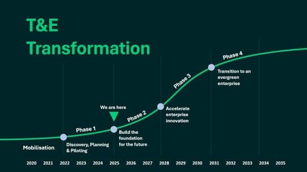 A graphic depicting the different stages of the T&E Transformation Programme. (Crown Copyright 2025)