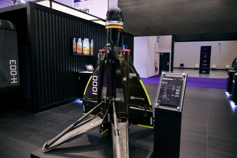 Anduril’s Roadrunner autonomous air vehicle, used for intercepting aerial threats, at DSEI Gateway UK 2025. (DSEI UK)