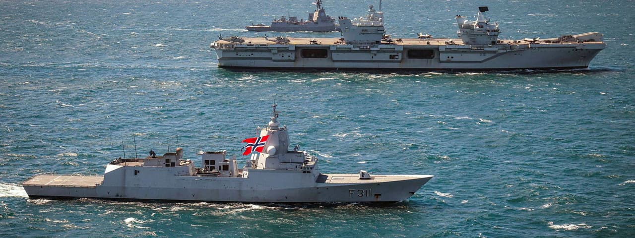 Norway's HNoMS Roald Amundsen (front), Royal Navy HMS Prince of Wales (middle), and Australia's HMAS Sydney (back) sail together during Operation Highmast this year. (UK MoD Crown Copyright 2025)