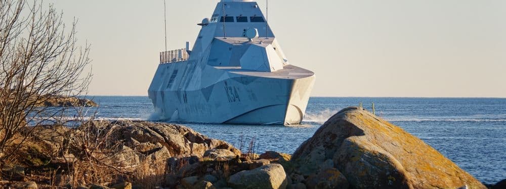 Swedish Navy Visby-class corvette HSwMS Nyköping in the Blekinge archipelago in Sweden in February 2023. (Lars-Goran Heden/Shutterstock.com)