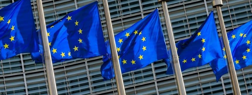 EU flags flying outside the headquarters of the European Commission. (Christophe Licoppe/Shutterstock)