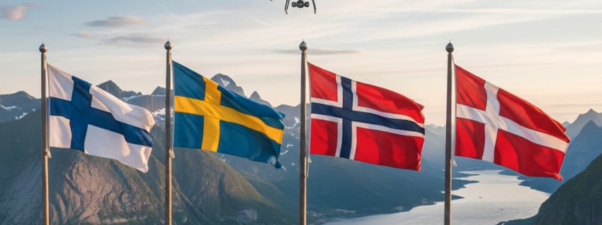 An AI generated image of the Finland, Sweden, Norway, and Denmark flags flying over a fjord, with drones hovering overhead. (Google Gemini AI)