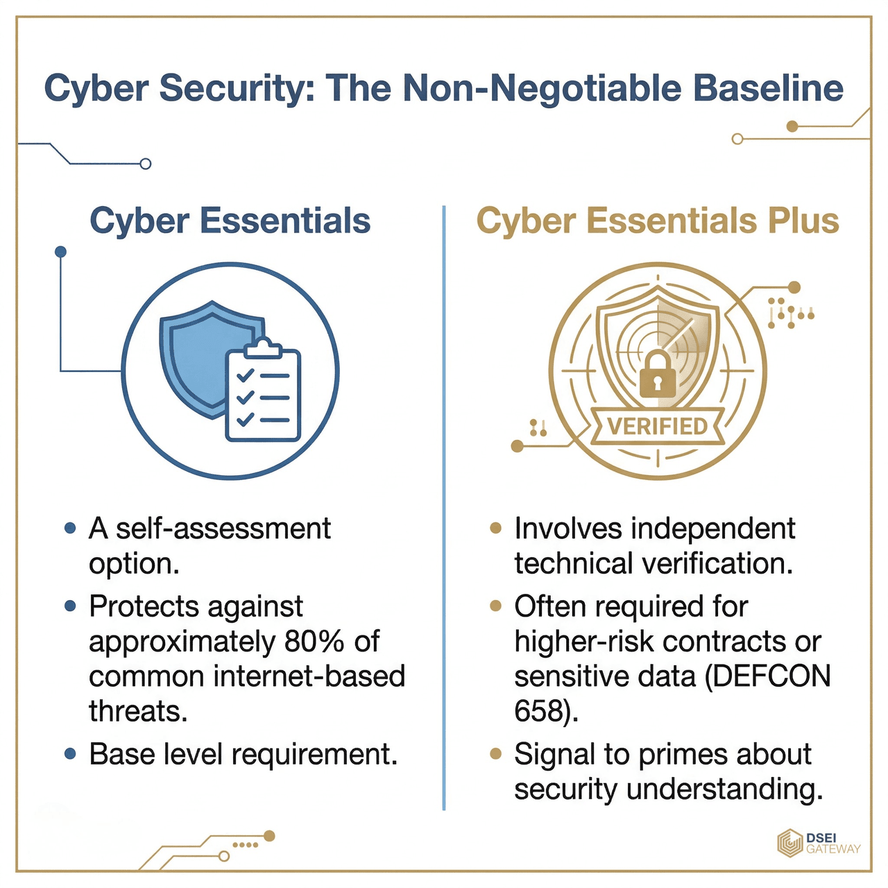 - Cyber Essentials Plus: Involves independent technical verification and is often required for higher-risk contracts or those involving sensitive data (governed by DEFCON 658).